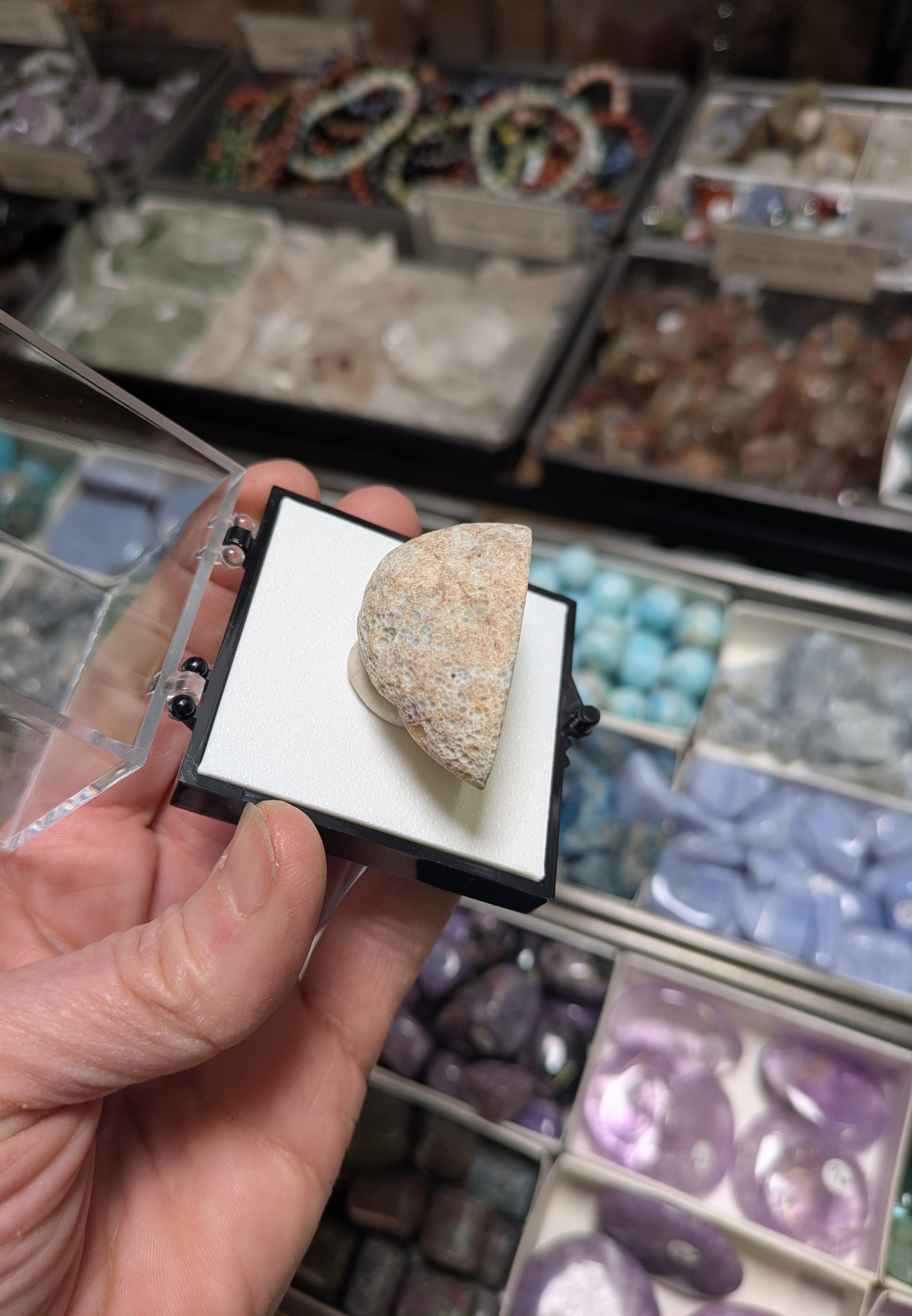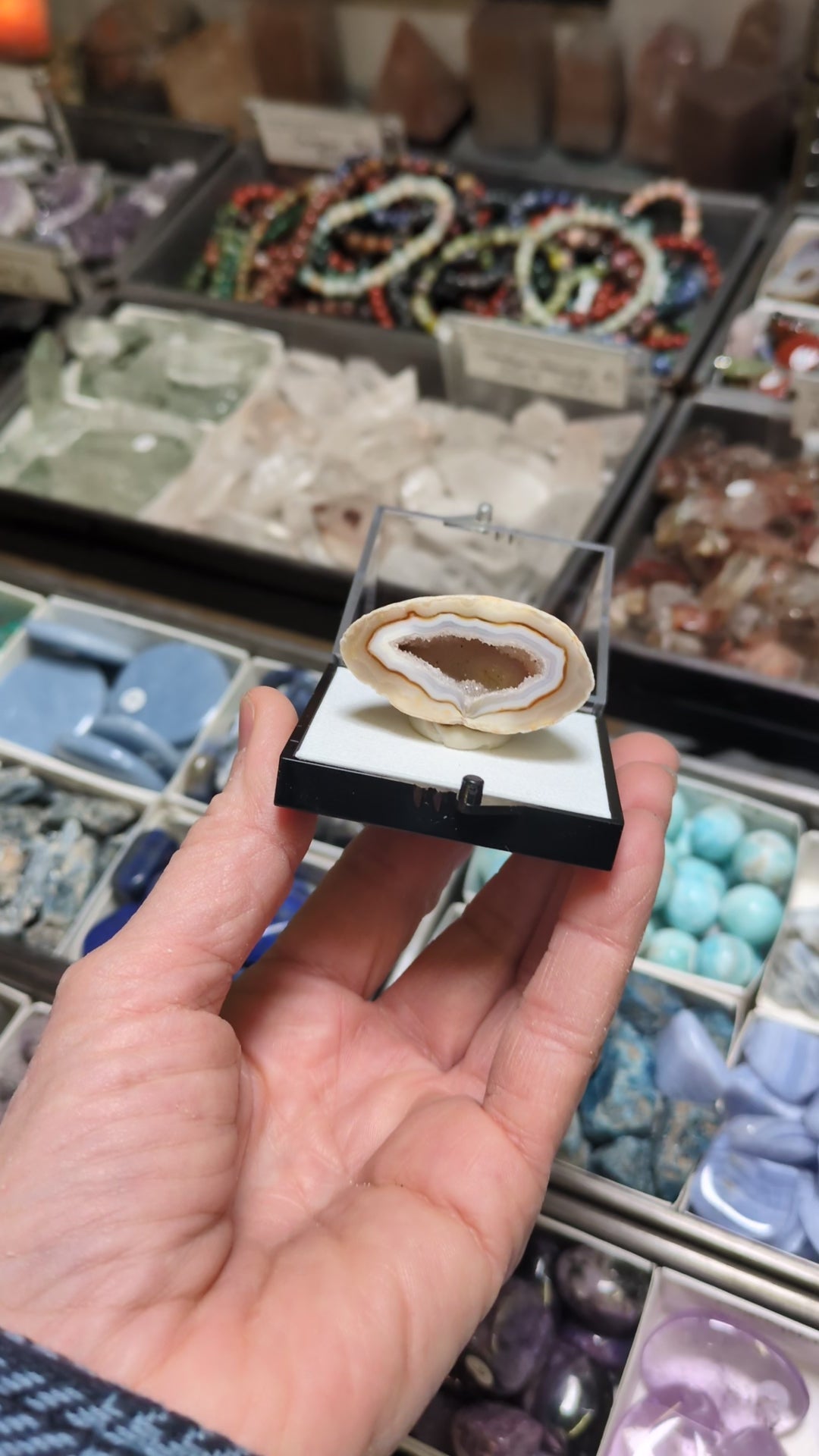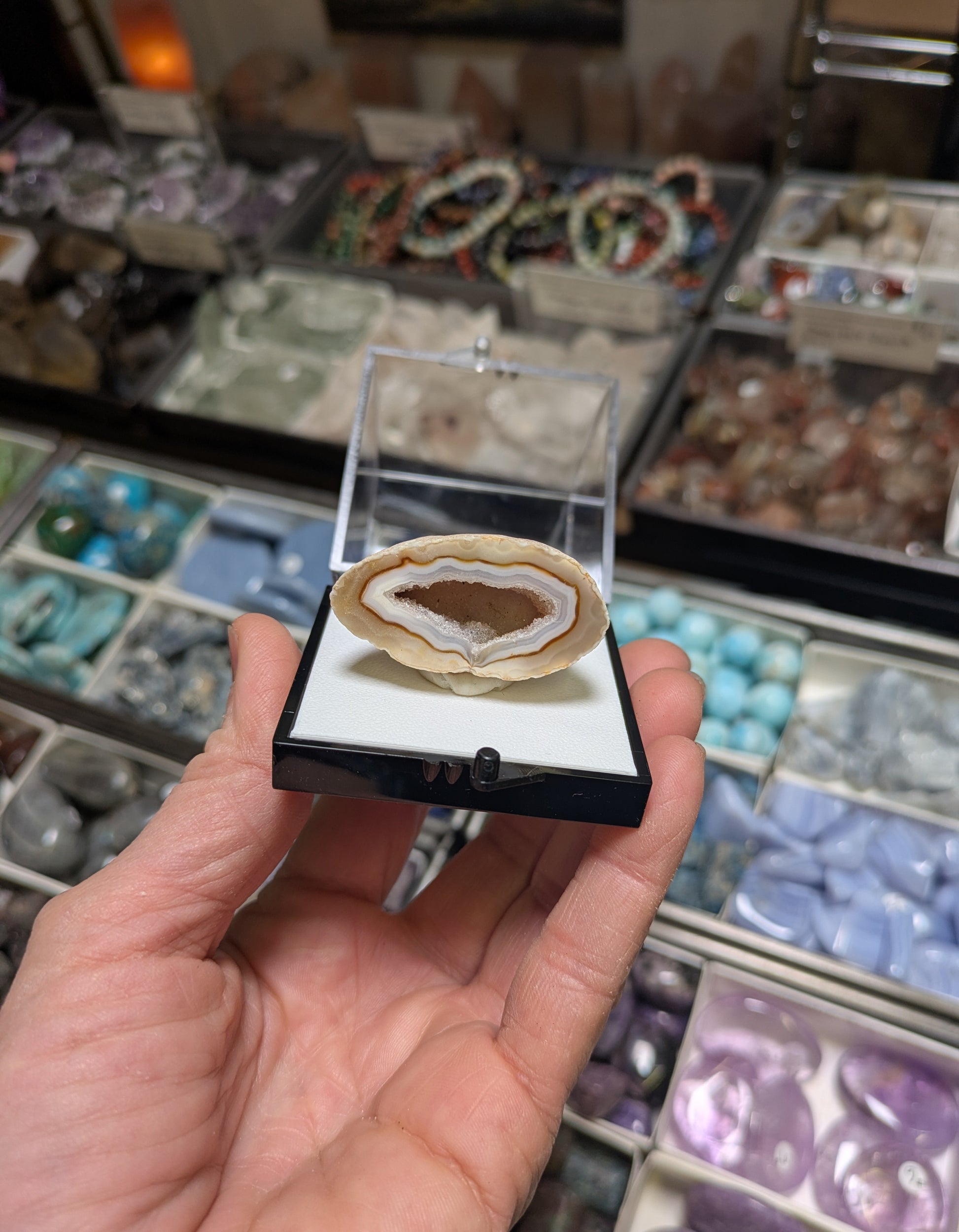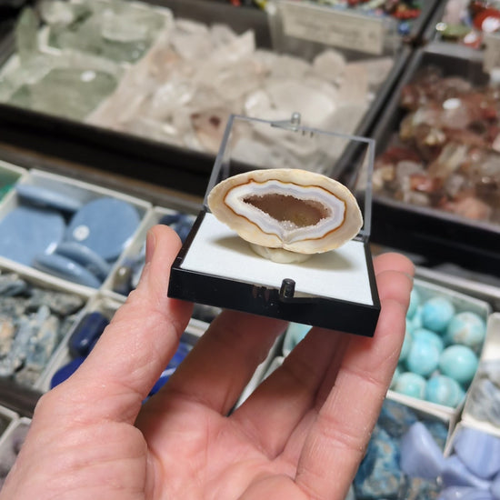 From Rio Grande do Sul in Brazil, this listing is for an agate geode with a sparkling drusy center. The agate center is surrounded by layers of agate, one is UV reactive. Installed in a medium size perky box with removable putty.