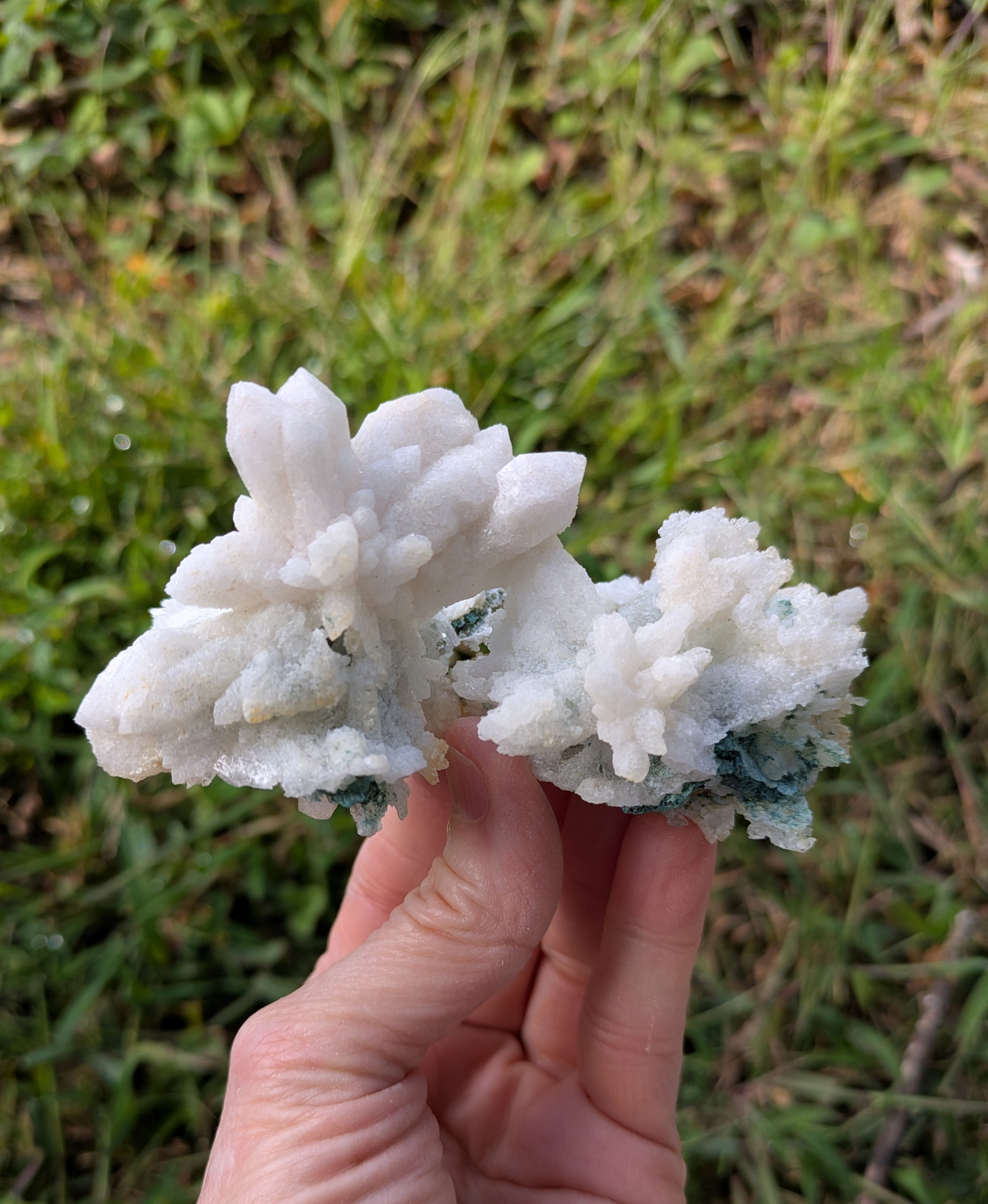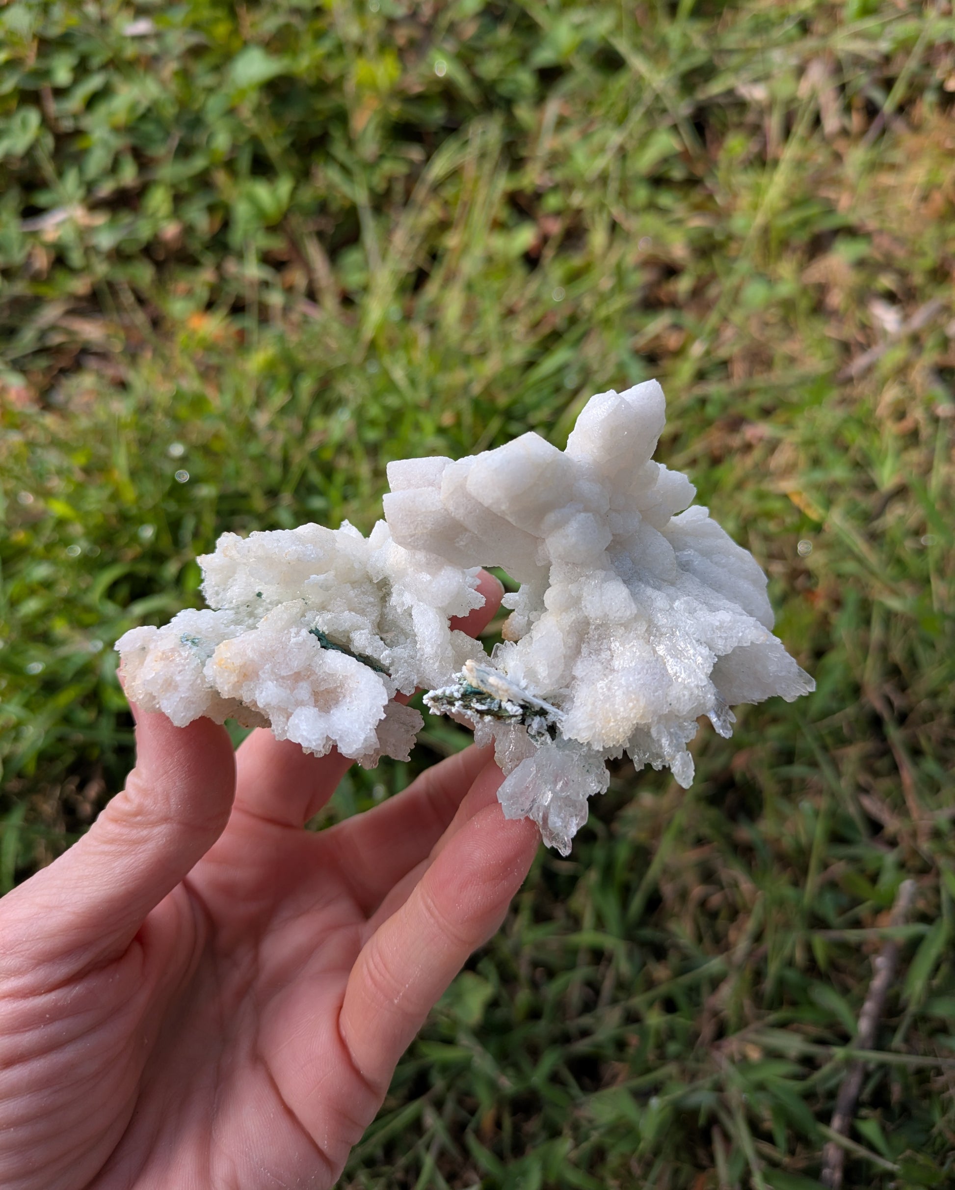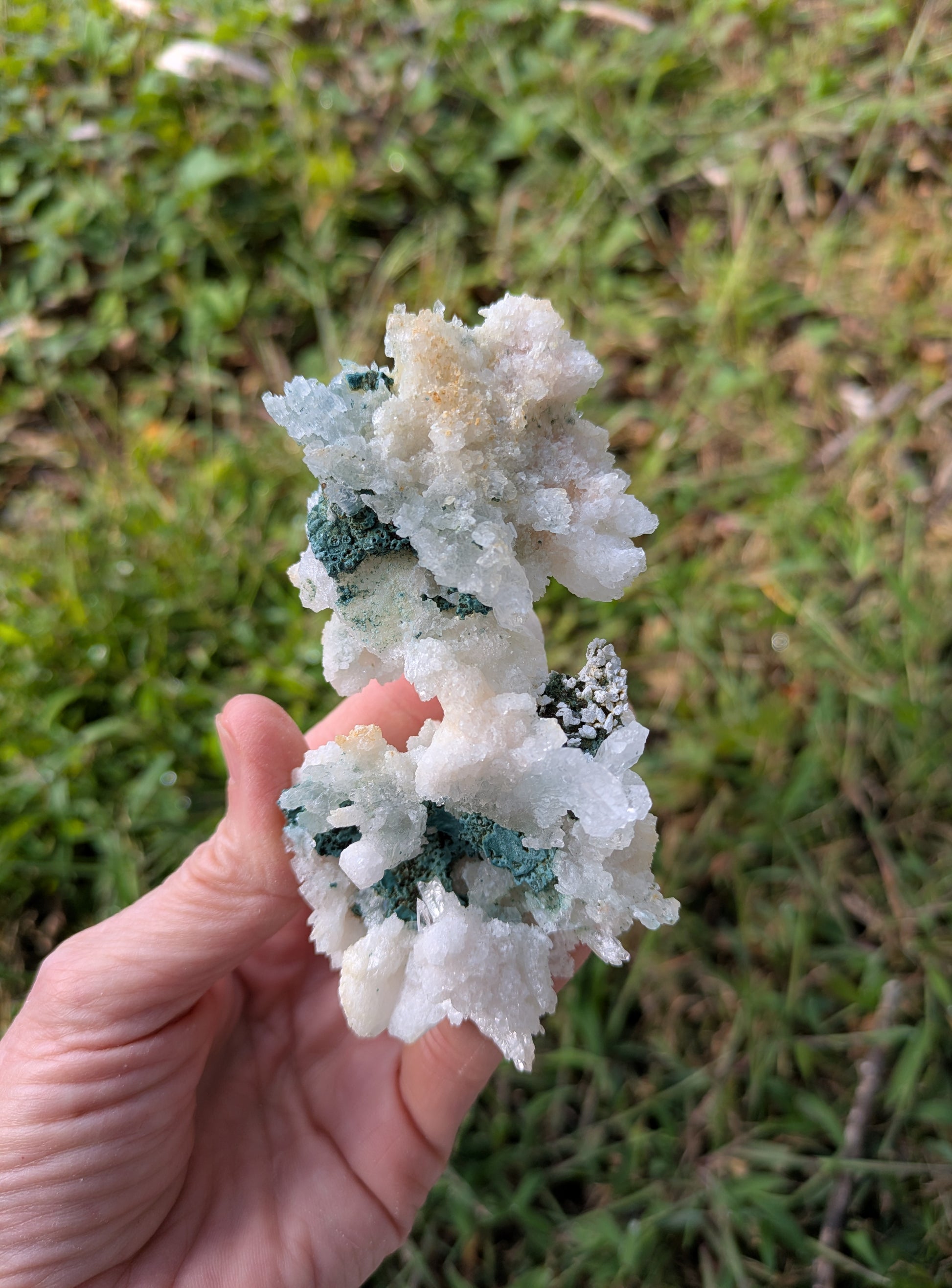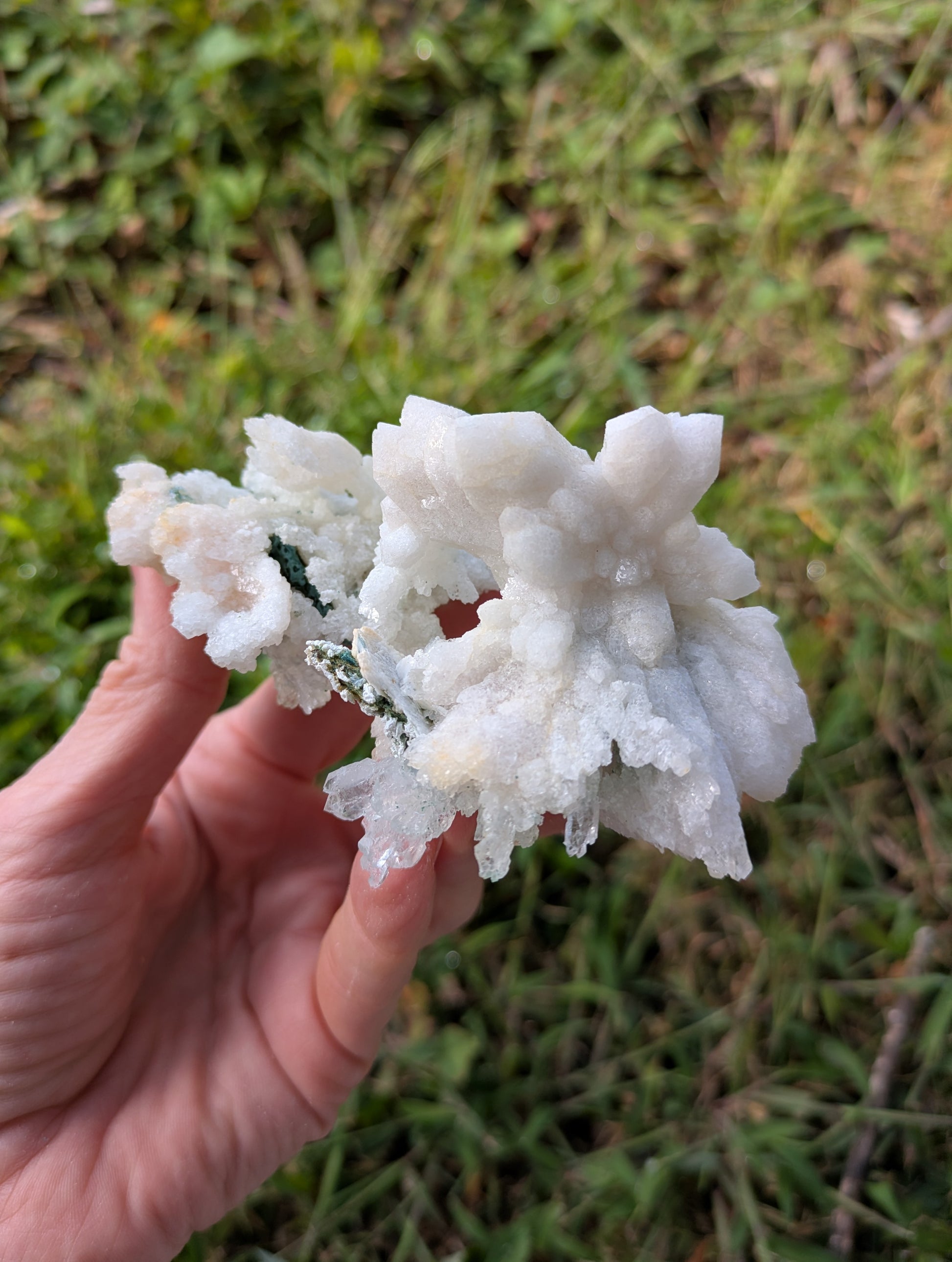 From Rio Grande do Sul in Brazil, this listing is for a dramatic specimen of amethyst flower quartz topped with terminated calcite crystals. The amethyst can barely be seen topside because it is graced with an abundance of snowy, terminated calcite crystals. This specimen is a beautiful, sculptural work of art.