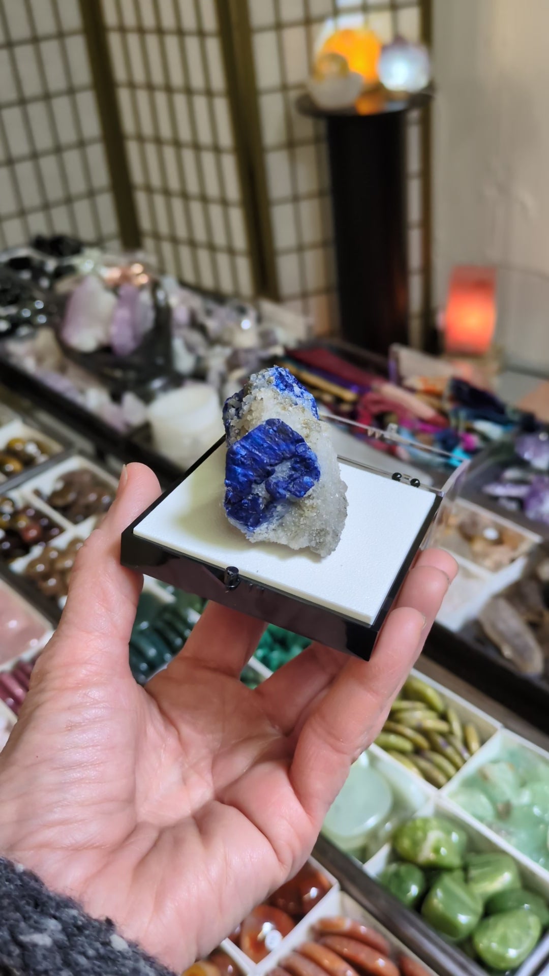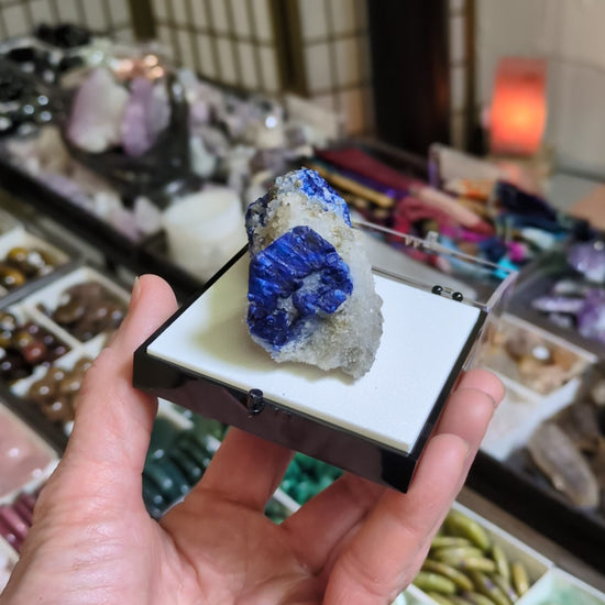 From Afghanistan, this listing is for a lazulite specimen with two brilliantly blue crystals of lazulite connected by a drusy quartz bridge. On unpacking this shipment, I was struck by the intensity of the blue and the overall vibrancy of these pieces. Installed in a large size perky box with removable putty.