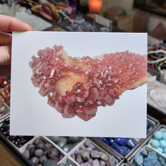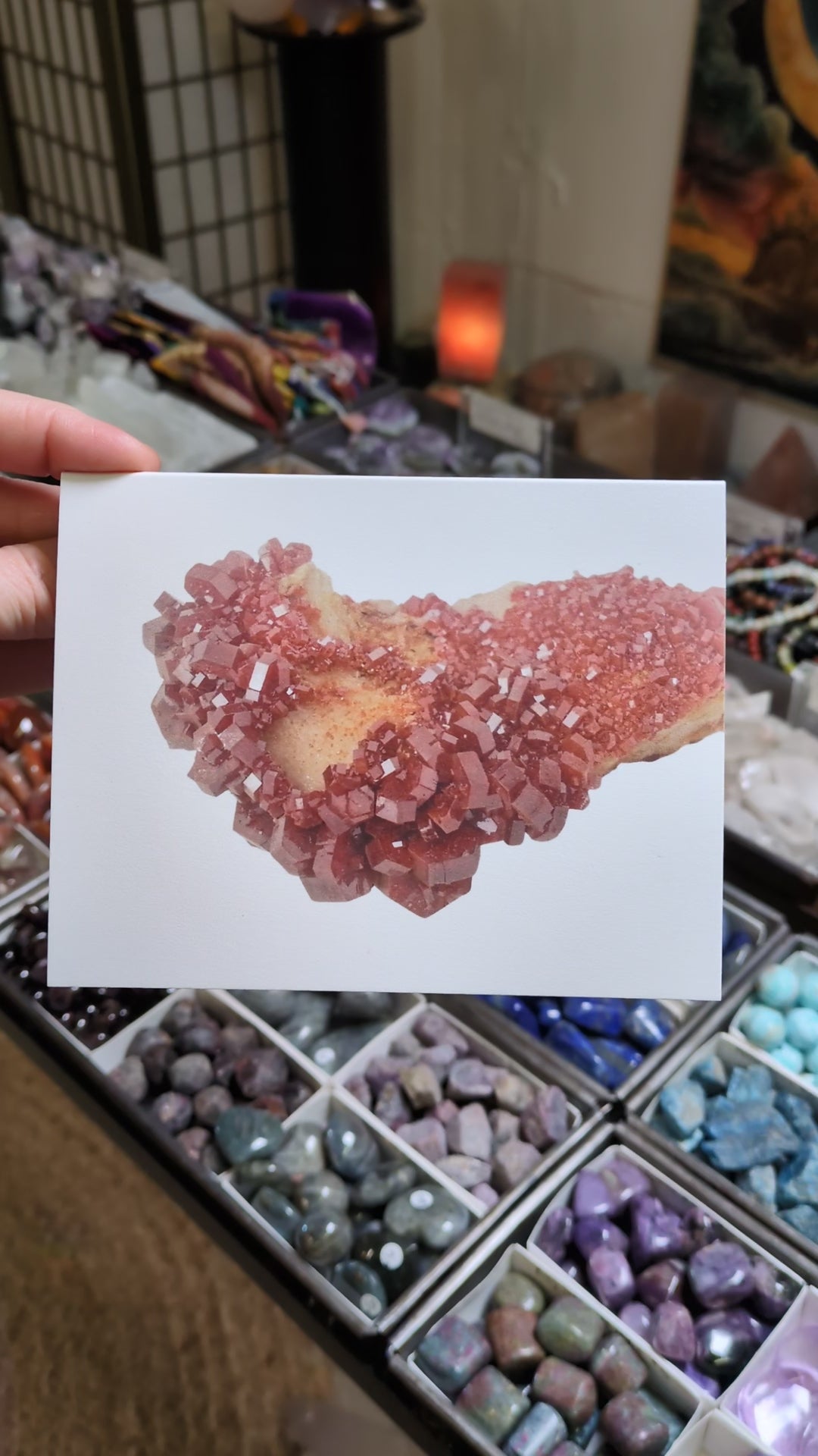 This listing is for a 5-card bundle including Desert Rose, Malachite, Galena, Vanadinite and Moonstone. You'll receive one of each type of card, if you'd like a different mix of crystals in your bundle, let us know. 2.25 X 5.50 inches. Envelopes included.