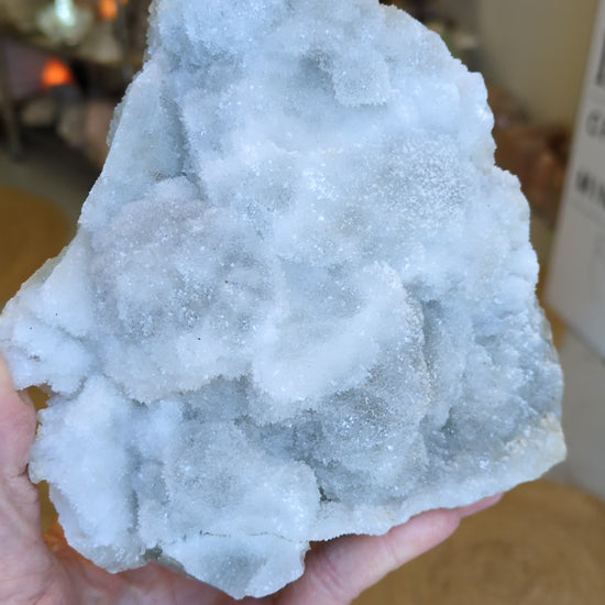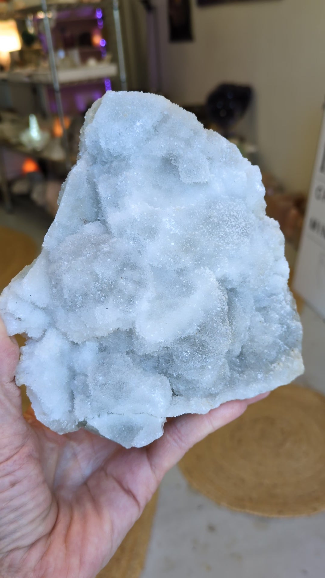From Hunan, China, this listing is for a 2 pound 12-ounce refreshing rough green fluorite iced with milky quartz drusy on one side. There are areas of clarity and translucency with a layer of purple that can barely be seen. The milky quartz side looks like fluffy clouds, and this fluorite stands upright.