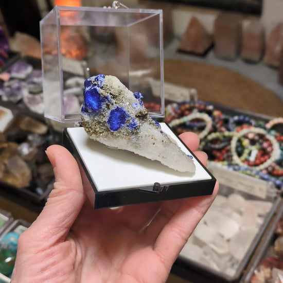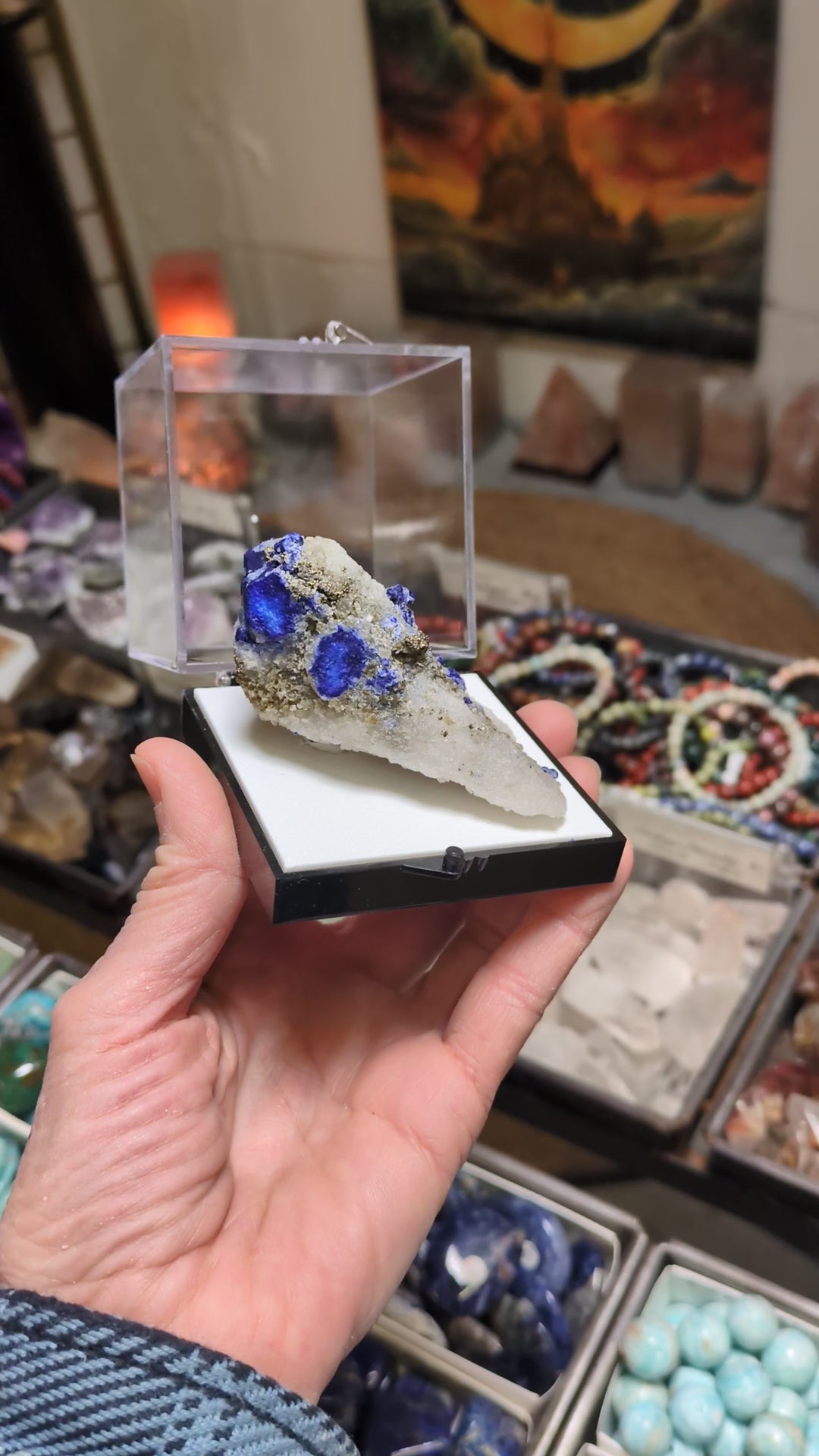 From Afghanistan, this listing is for a lazulite specimen with multiple brilliantly blue crystals of lazulite in quartz with pyrite. The pyrite is evident throughout. On unpacking this shipment, I was struck by the intensity of the blue and the overall vibrancy of these pieces. Installed in a large size perky box with removable putty.
