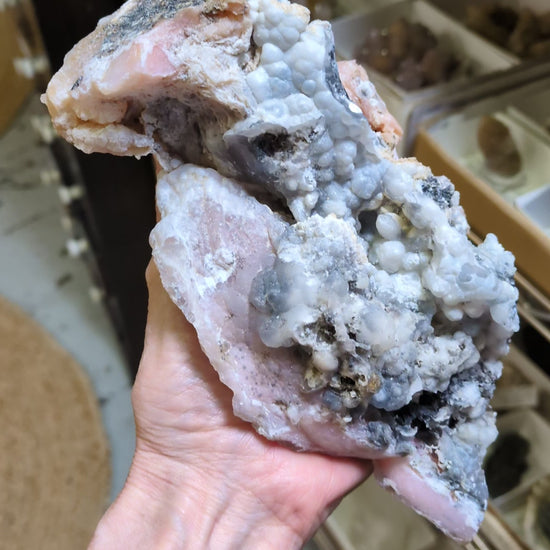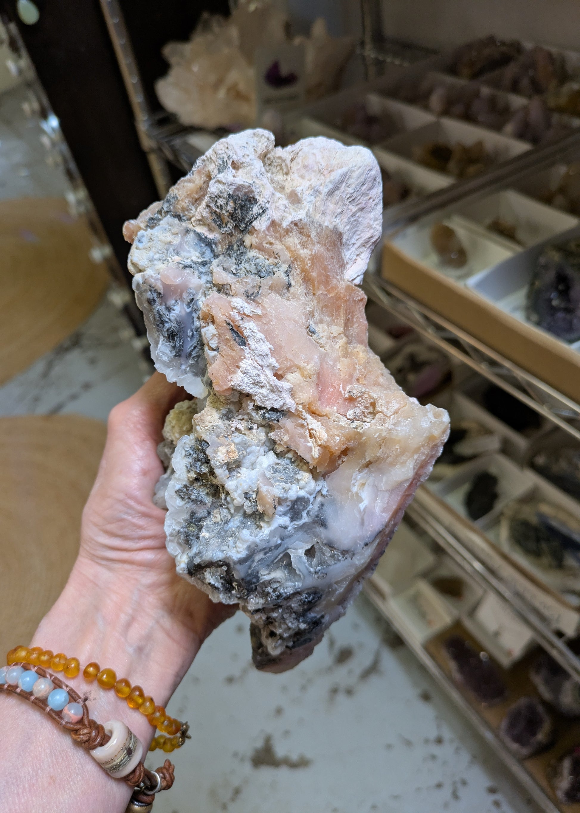 From Ica Dept., Peru, this listing is for a 2-pound pink opal. There are sections where the opal has formed in a bubbly, botryoidal habit, dendrites and layers. Specs of shiny mica are pressed between layers, along with a soft pink, milky mineral mix of pink opal and either kaolinite or feldspar.