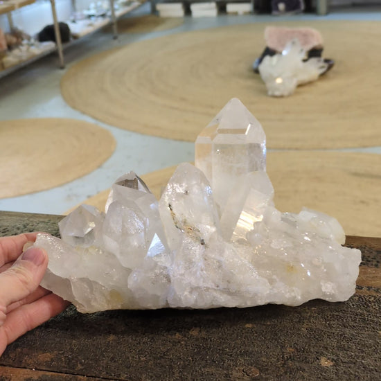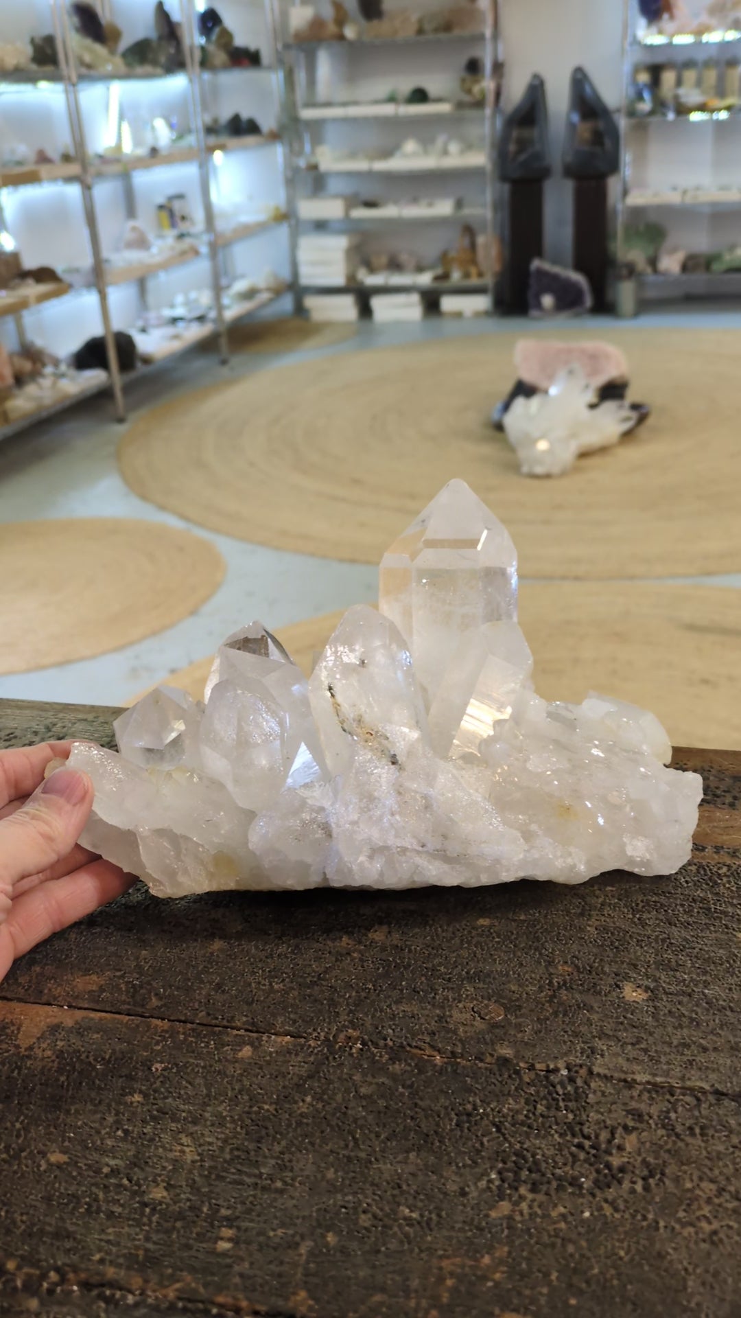 From Brazil, this listing is for a 4 pound 6-ounce (1.985 KG) quartz cluster. This quartz cluster is vibrant with nice clarity. This dramatic and well-balanced cluster has large points along with one prominent point with inclusions of iron and clinochlore. This cluster displays well horizontally on its naturally flat base.