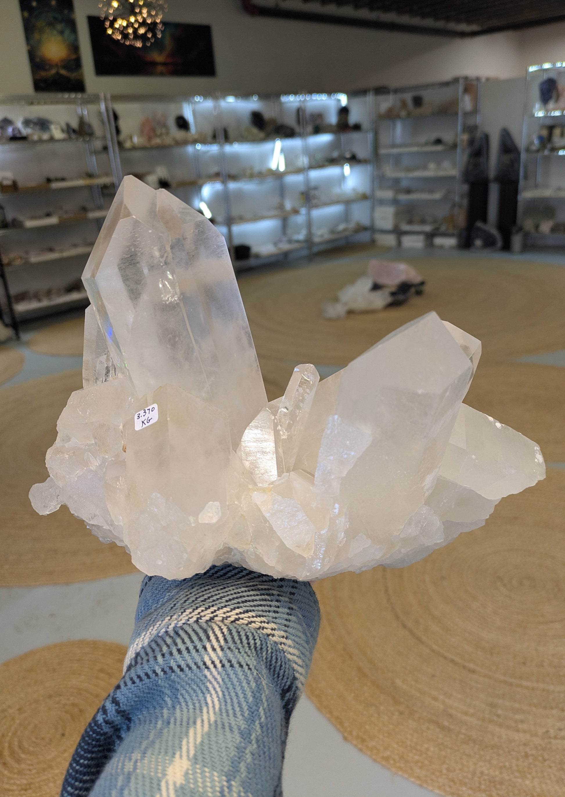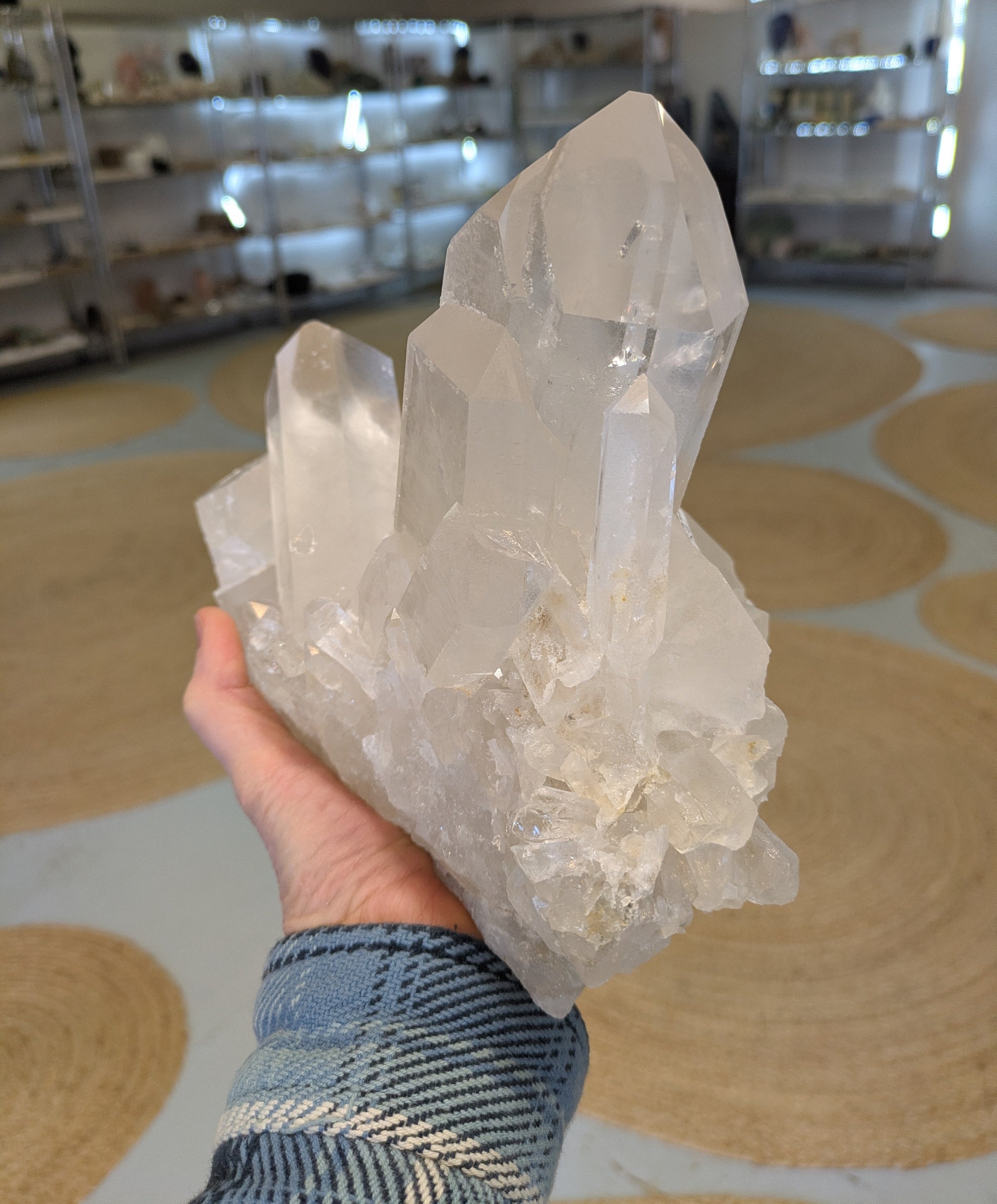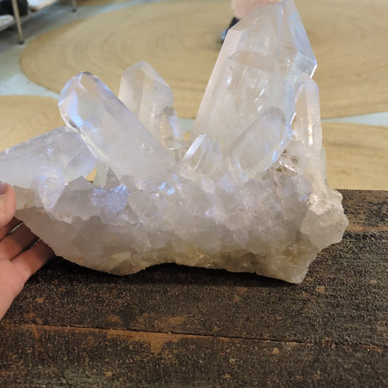 From Brazil, this listing is for a 7 pound 6-ounce (3.370 KG) quartz cluster. This quartz cluster is vibrant with frosty and clear points. This dramatic and well-balanced cluster has large points along with one prominent point that is a tantric twin. This cluster displays well horizontally on its naturally flat base. There is some mineralized feldspar on the surface, this does not distract from its beaty and covers very little area.
